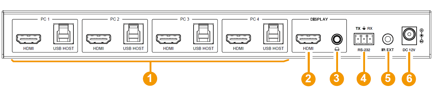1 | PC 1-4接口 | HDMI: HDMI信號輸入口,通過HDMI線連接HDMI信號源設備,如PC。 USB HOST: USB Host接口,與對應的HDMI信號輸入口連接到同一臺PC。 注意:PC 1 USB HOST接口可用于固件升級。 |