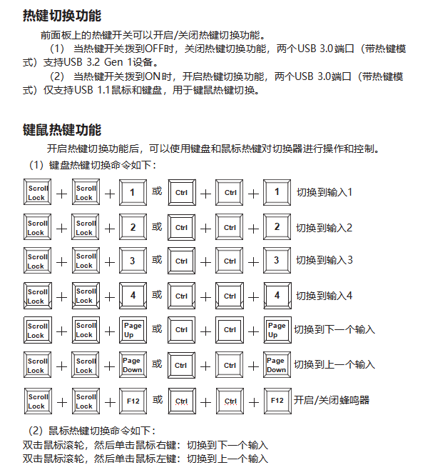 2 | USB3.0接口(帶熱鍵模式) | ?當熱鍵切換功能關閉時,該接口支持USB 3.2 Gen 1設備。 ?當熱鍵切換功能開啟時,該接口僅支持USB 1.1,連接鼠標和鍵盤,支持鍵鼠熱鍵切換命令。 |